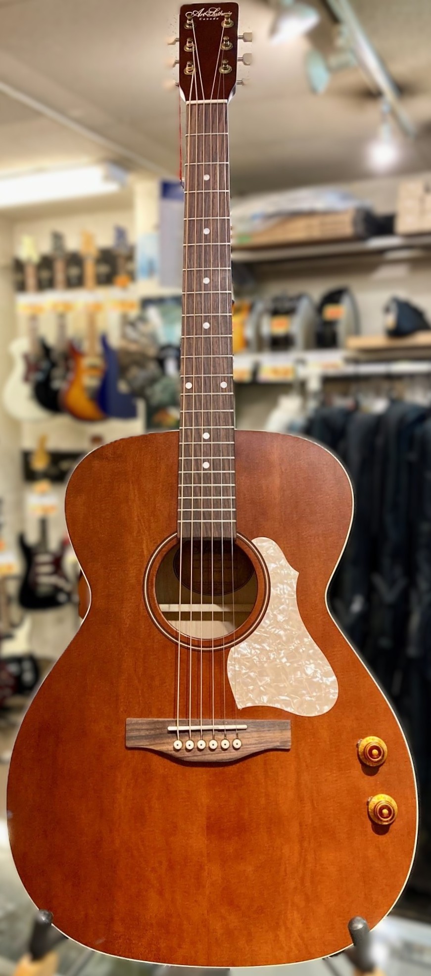 カナダGodin社のブランドの一つ「Art&Lutherie」のエレアコ。ソリッド・シトカスプルーストップ、バック&サイドのワイルドチェリーはソリッドウッドをラミネートした独自の3層構造、シルバーリーフ・メイプルのネックとの組み合わせにより安定して優れたトーンを生み出します。